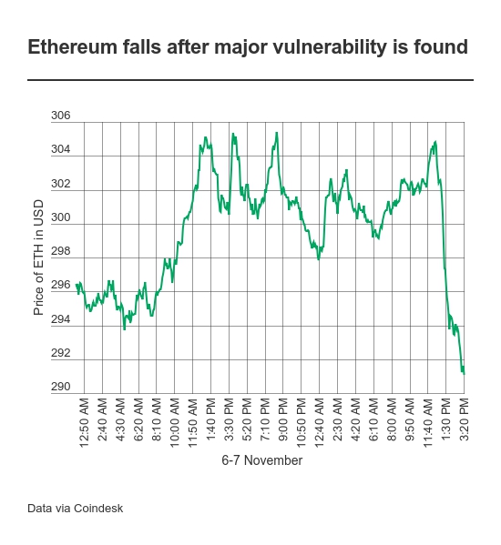 По оценке аналитика UCL Матрика Маккорри, могла быть заблокирована сумма в 600 тысяч электронных “монет” (или примерно $150 миллионов). Как сообщил создатель Polkadot (и основатель Polkadot) Гэвин Вул, заморожены могут быть все Ethereum-сделки, связанные с ICO (привлечением средств в криптовалюте). На фоне новостей об уязвимостях цена “эфира” резко упала, до самого низкого за две недели уровня — с $305 до $291.