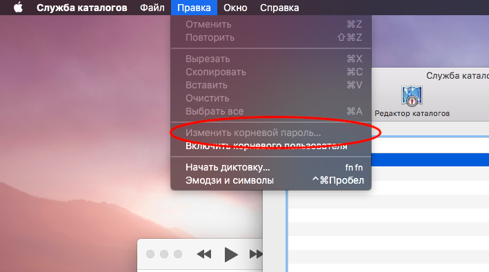 запустить системные настройки, перейти в меню «Пользователи и группы», открыть подменю «Параметры входа», нажать на клавишу «Подключить» рядом с надписью Сетевой сервер учетных записей, во всплывающем окне нужно выбрать пункт «Открыть Службу каталогов», в меню-баре нужно открыть меню «Правка» и выбрать опцию «Изменить корневой пароль».